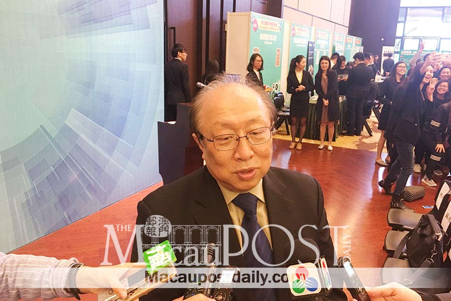 Zhao Wei, rector of the University of Macau (UM), speaks to reporters yesterday on the sidelines of the opening ceremony of the Career and Internship Fair 2017 at the UM Guest House. – Photo: Debby Seng