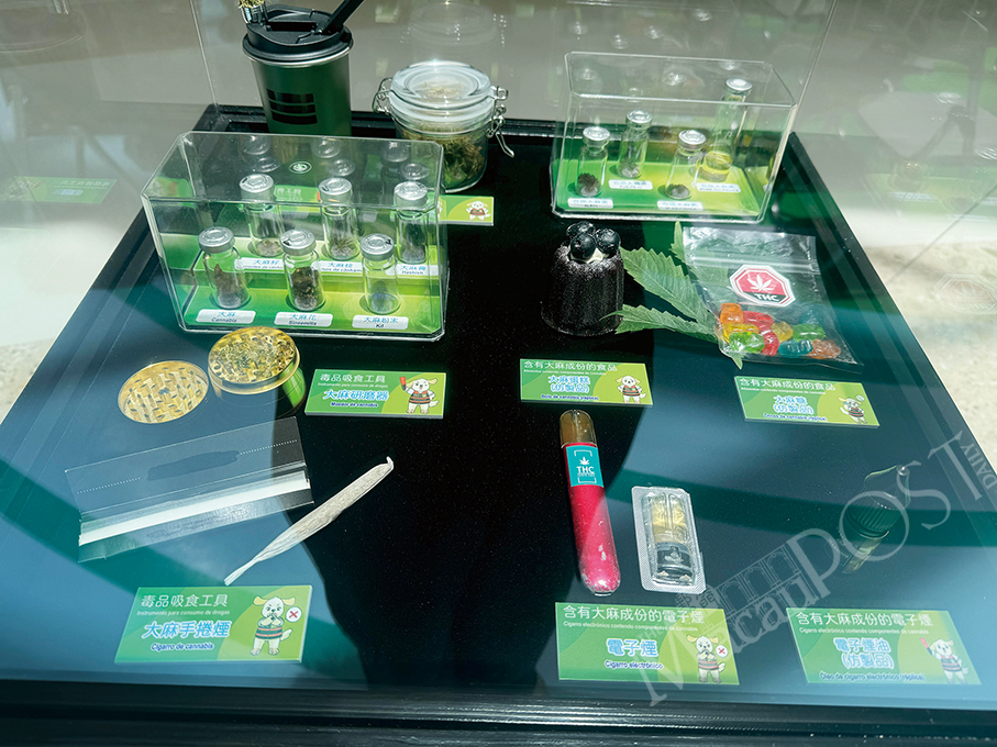 Real drug specimens are displayed during the “Citywide Anti-Drug Week” campaign at NOVA Mall in Taipa.
