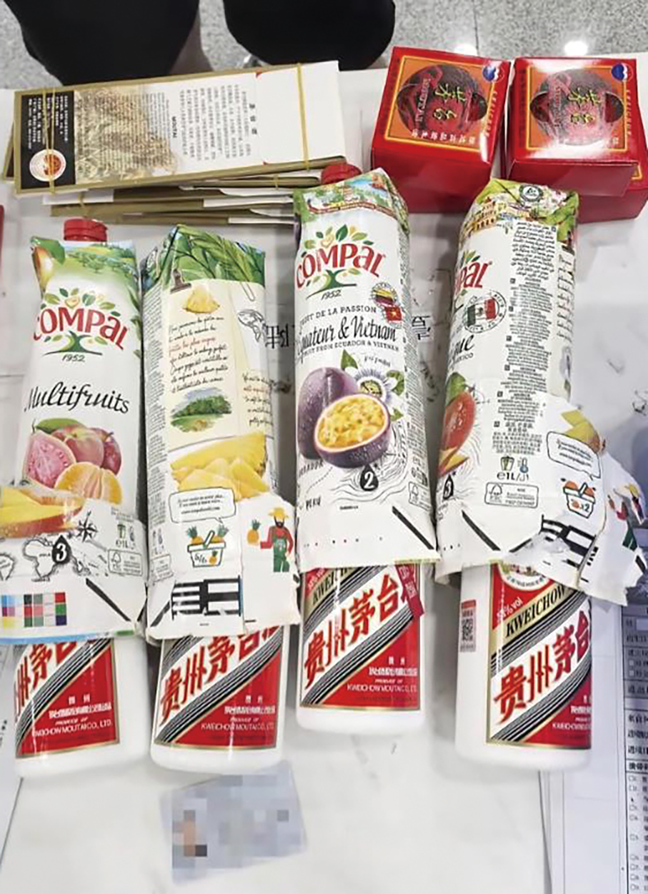 Zhuhai’s Gongbei Customs announced yesterday that its officers nabbed a male mainlander for smuggling four bottles of Maotai liquor from Macau to Zhuhai hidden in four juice boxes.