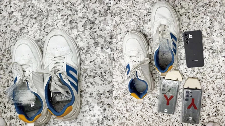 This undated handout provided by Zhuhai’s Gongbei Customs shows four used smartphones wrapped in plastic film hidden inside the smuggler’s shoes.