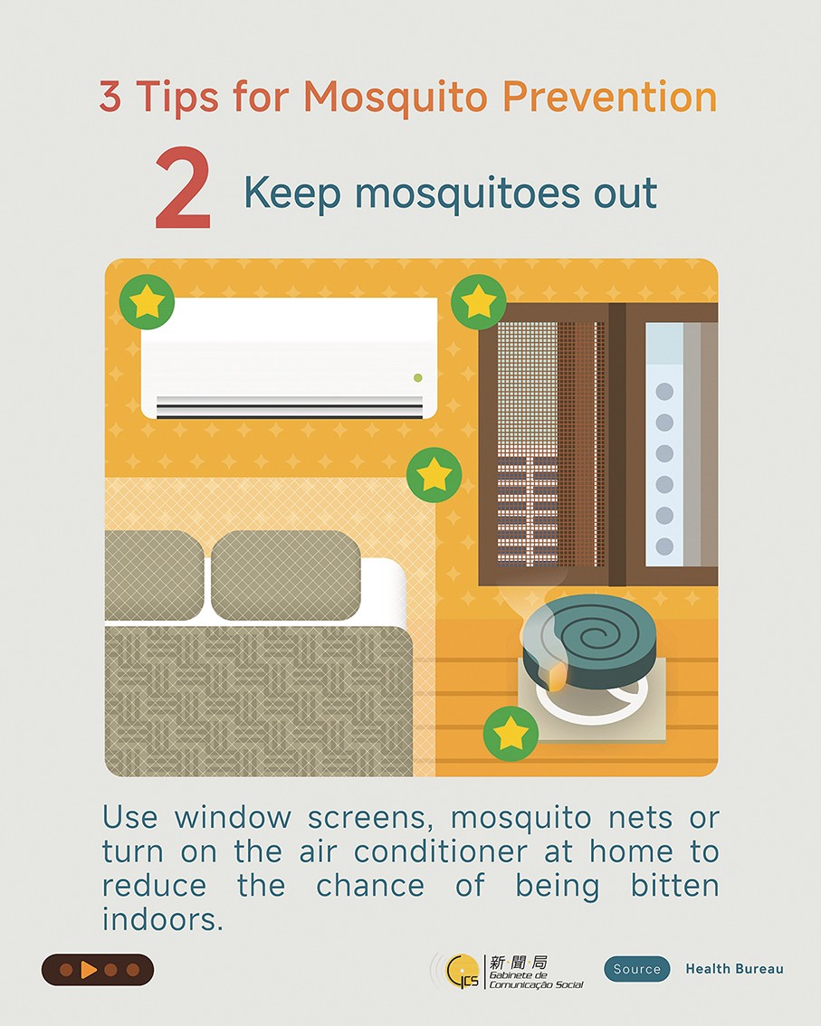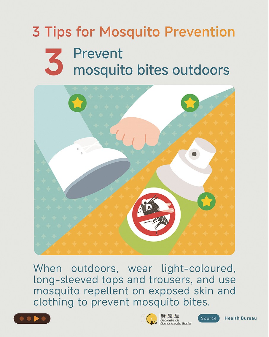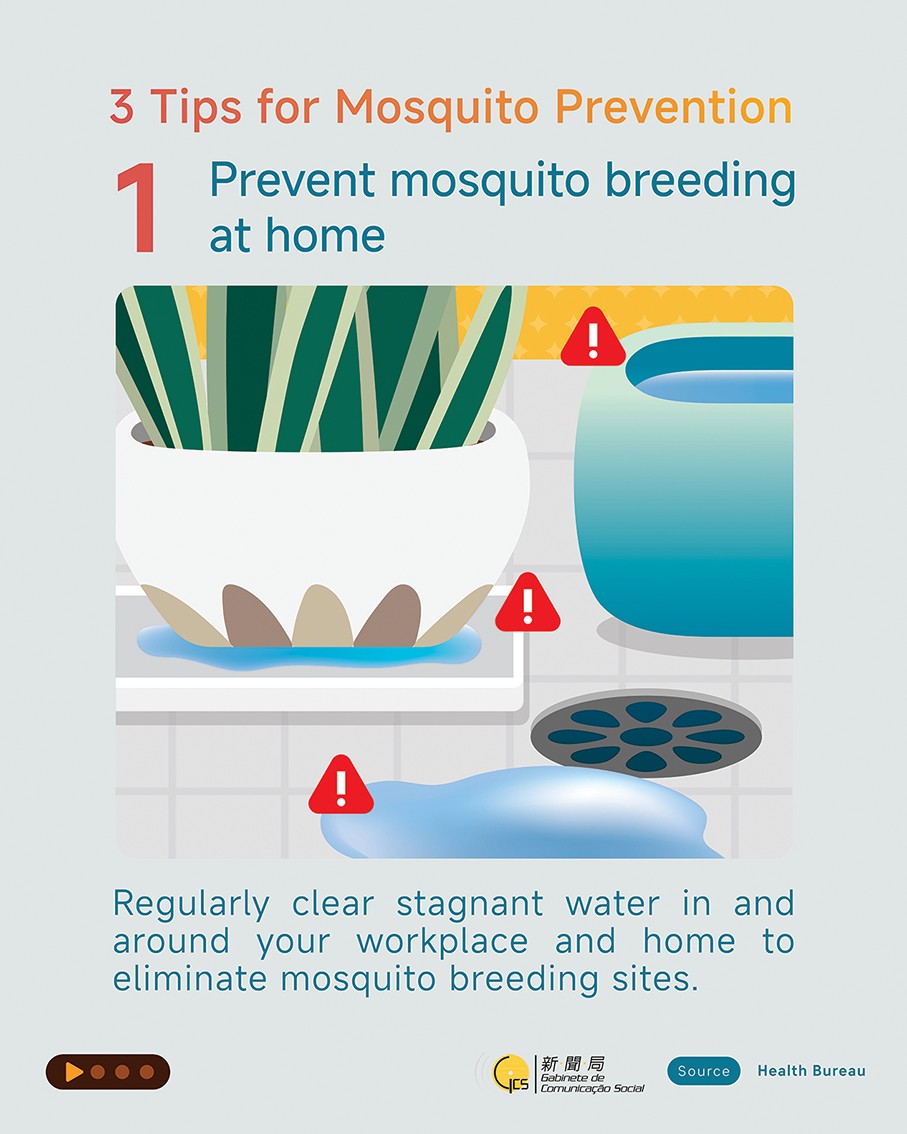 These three infographics provided by the Health Bureau (SSM) give the public three tips of how to avoid the chikungunya fever.