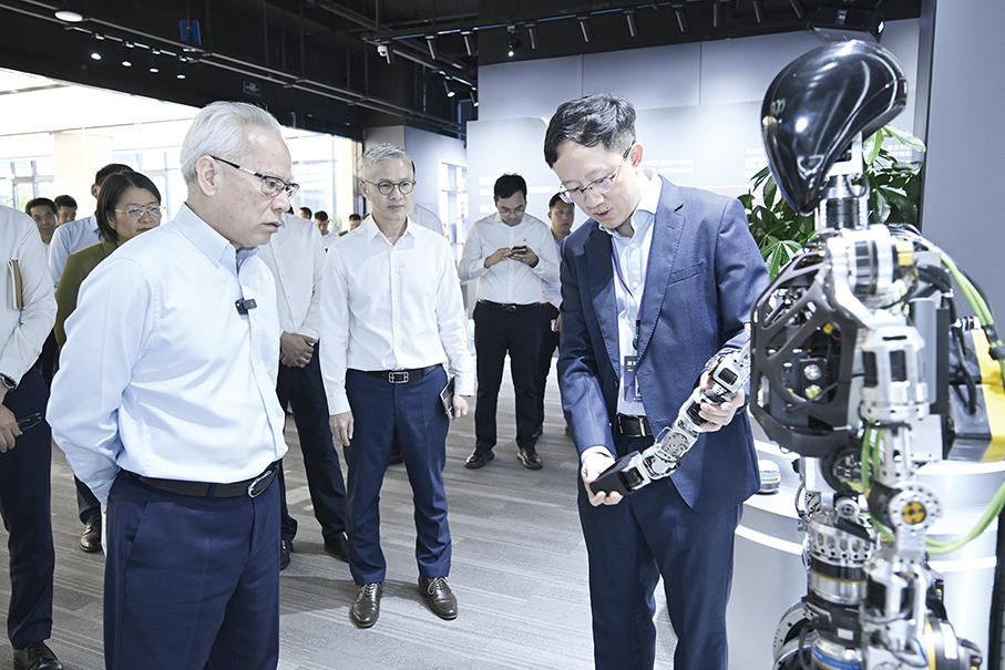 Chief Executive Sam Hou Fai is briefed yesterday by a staff member about the functions of a robot while visiting a tech enterprise in Shanghai specialising in the development and production of general-purpose robots. – Photos: GCS