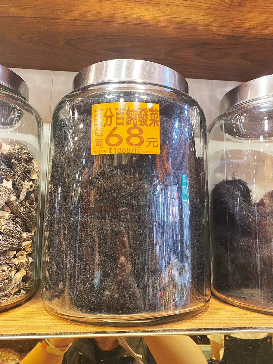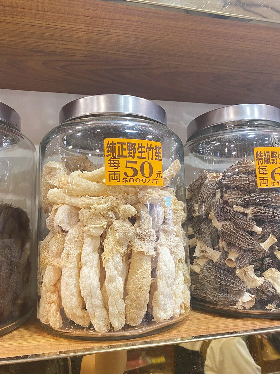 The three other products are bulk dried matsutake, fat choy and bamboo fungus, all sampled from a dried goods shop (爛記參휙베瓘癎斤) located on Rua da Emenda (義俚쌍).