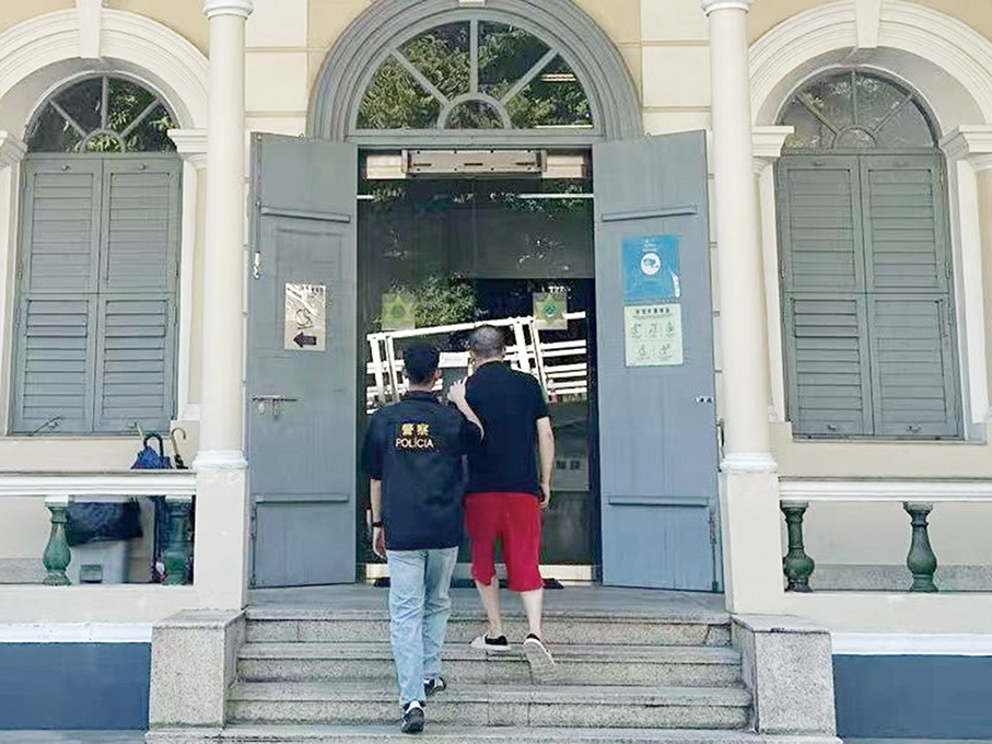 This undated handout photo provided by the Public Security Police (PSP) yesterday shows a PSP officer escorting the ‘baijiu’ theft suspect into a police station.