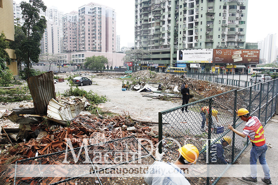 This undated handout photo provided by the Macau Government Information Bureau (GCS) yesterday shows workers fencing in the recently recovered plot in Taipa.