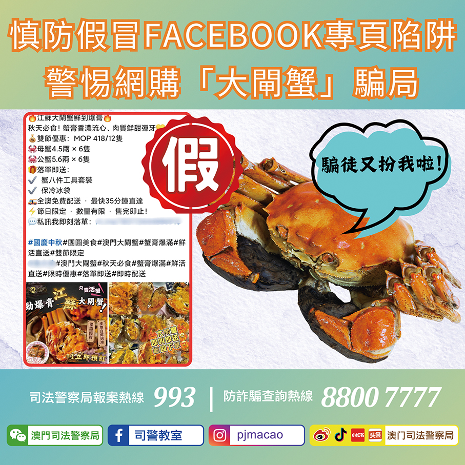 This undated handout image provided by the Judiciary Police (PJ) yesterday urges residents to be wary of online hairy crab purchase scams.