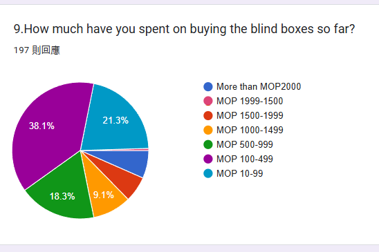 Among the respondents, about three quarters reported having bought at least one blind box before. Specifically, 38.1 percent of students who had purchased blind boxes indicated spending between 100-499 patacas, while 18.3 percent spent 500-999 patacas, and 6.6 percent exceeded 2,000 patacas. This indicates that some students are deeply invested in this hobby.