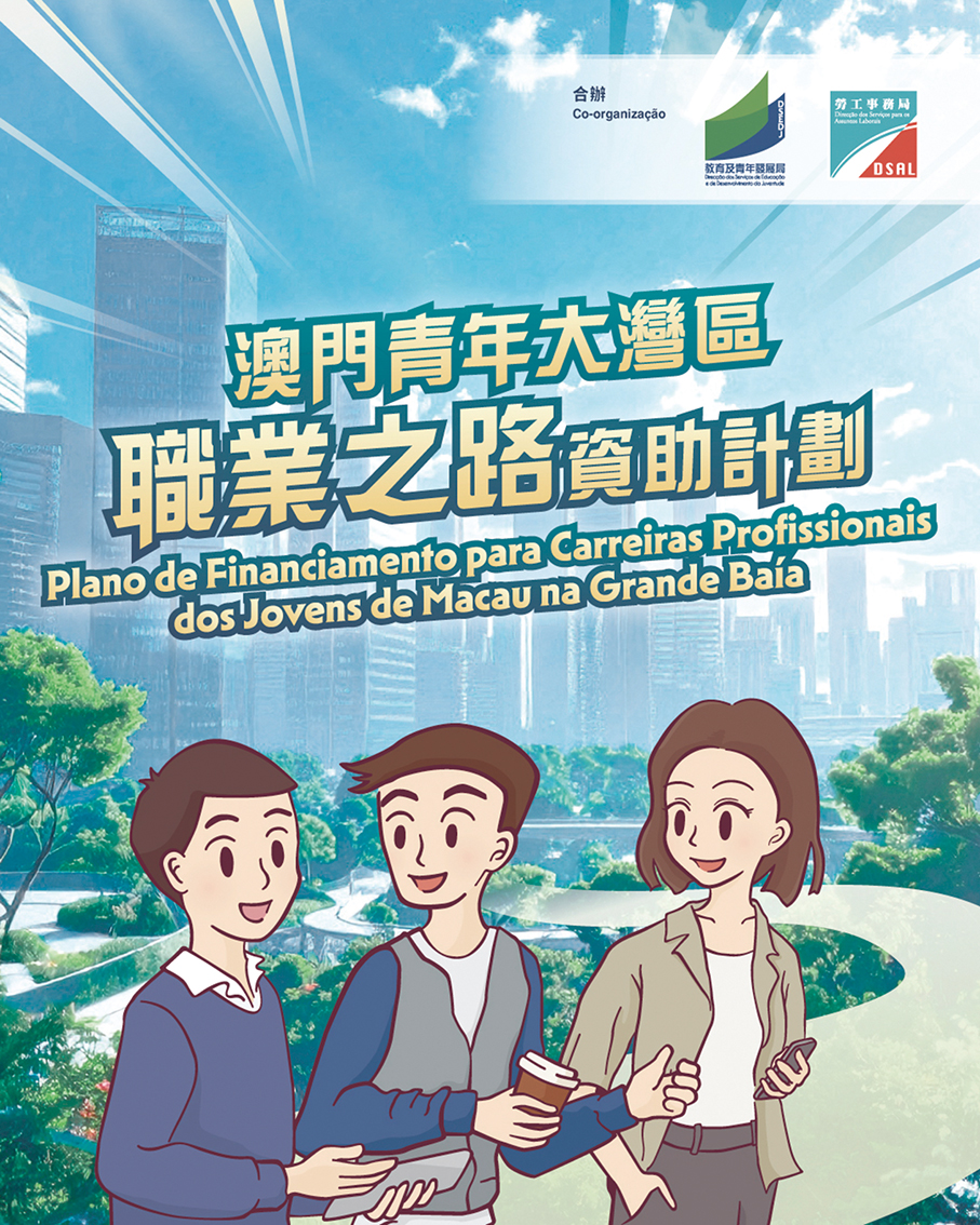 This poster downloaded from the Education and Youth Development Bureau’s (DSEDJ) website yesterday promotes the 5,000-pataca monthly subsidy for young locals to work in the GBA mainland cities. The bureau implements the subsidy programme in collaboration with the Labour Affairs Bureau (DSAL).