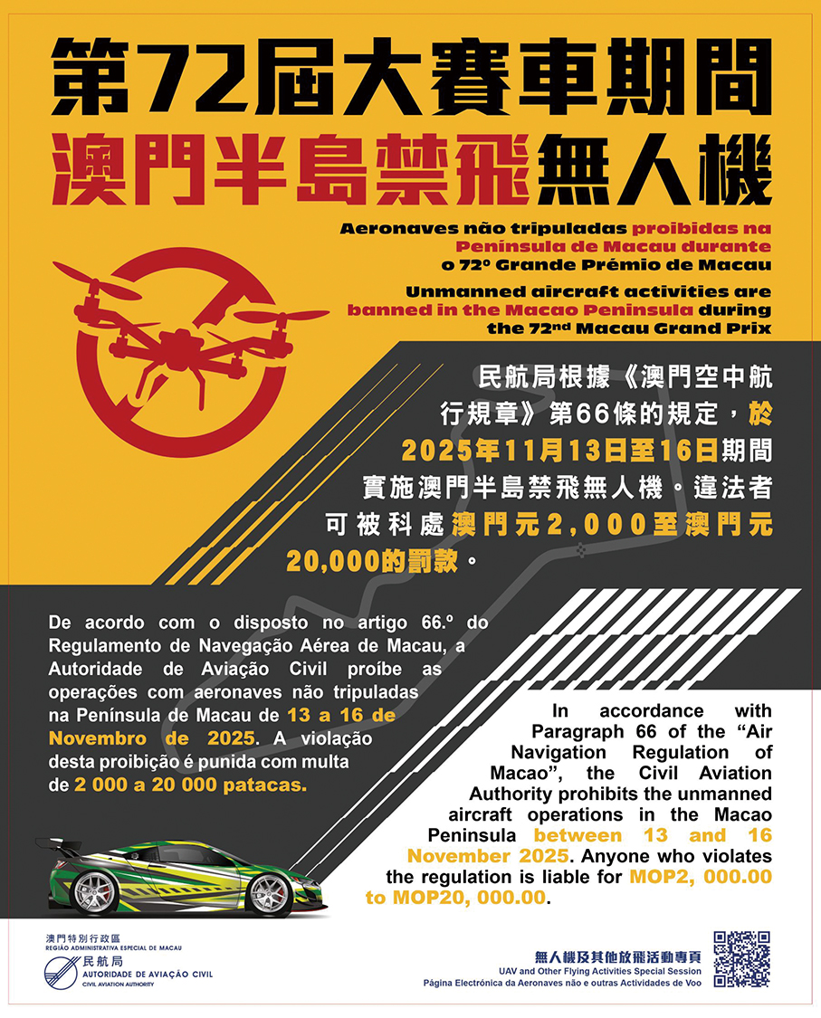 The Civil Aviation Authority of Macau (AACM) announced in a statement yesterday that unmanned aircraft flights will be prohibited across the Macau Peninsula from today through Sunday to ensure safety during the 72nd Macau Grand Prix (MGP).