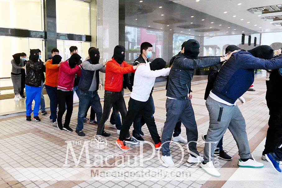 Judiciary Police (PJ) officers escort the hooded karoke “drug party” suspects from the PJ headquarters in Zape to vehicles yesterday. Photos: Iong Tat Choi