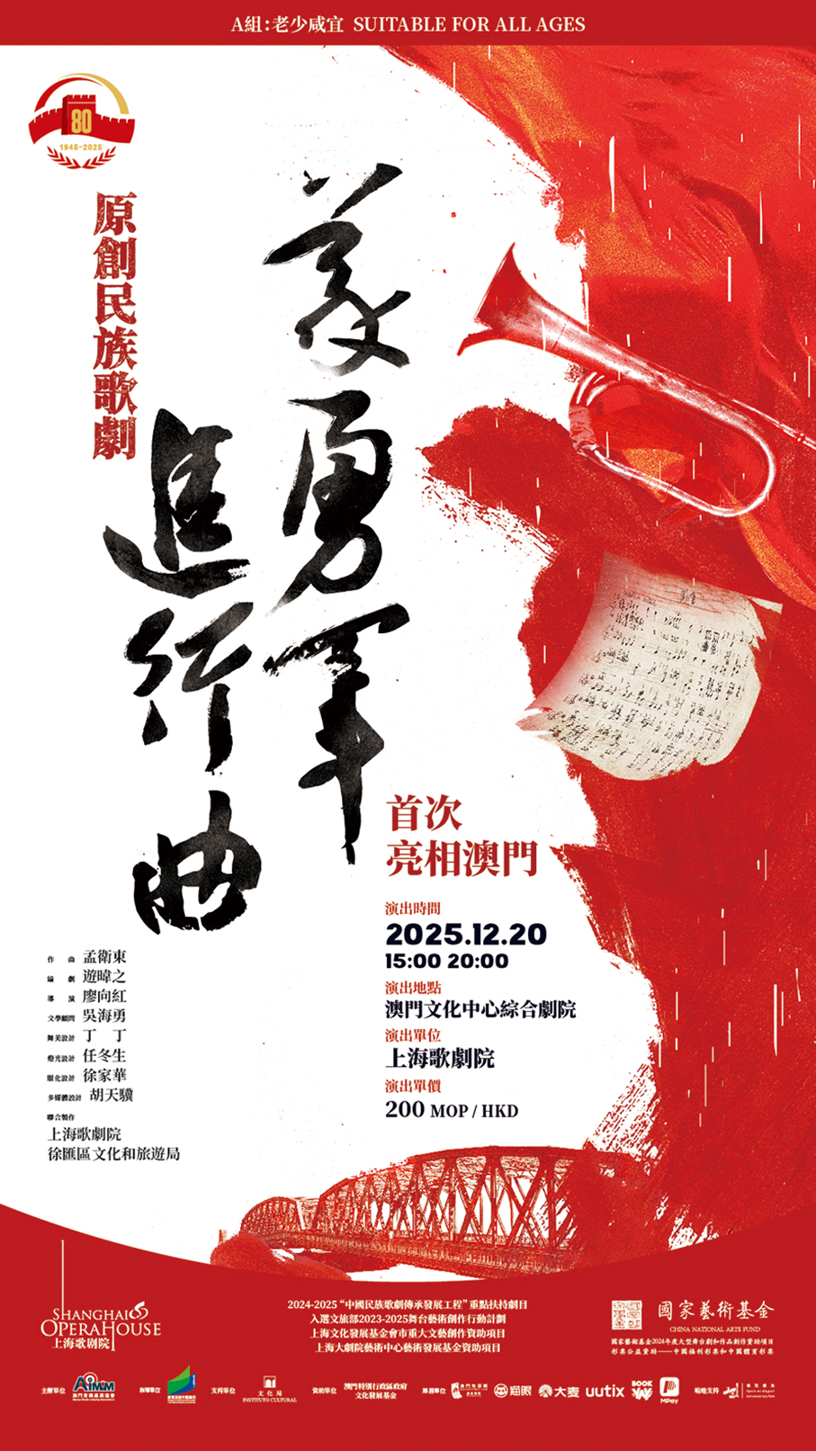 The performance is a joint production by the Shanghai Opera House and the Xuhui District Culture and Tourism Bureau, and serves to commemorate two major historical milestones: The 80th Anniversary of the Victory of the Chinese People’s War of Resistance Against Japanese Aggression and the World Anti-Fascist War, and the 90th anniversary of the creation of the “March of the Volunteers,” the national anthem of the People’s Republic of China (PRC).