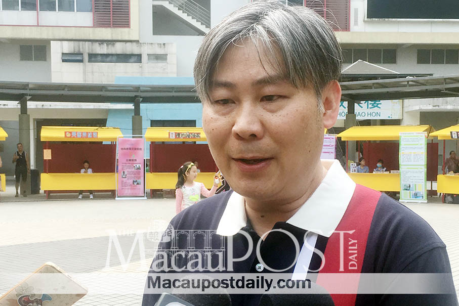 Macau Special Olympics chief Hetzer Siu Yu Hong speaks to reporters yesterday in Iao Hon Market Park on the sidelines of the opening ceremony of free physical, speech and occupational assessment tests for children provided by his association. Photo: Debby Seng