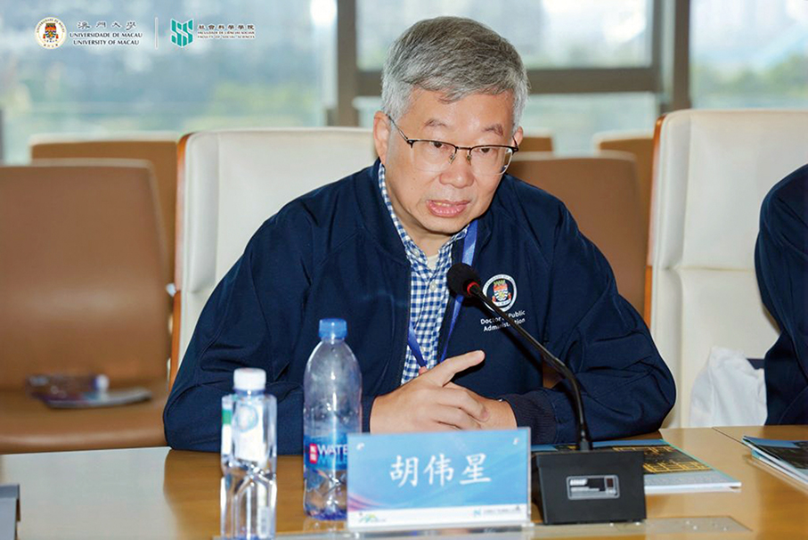 This undated handout photo provided by the University of Macau (UM) yesterday shows the Dean of the Faculty of Social Sciences (FSS), Prof. Richard Hu Weixing, delivering remarks at the Nansha International Talent Port during the three-day study tour to Guangzhou. ,