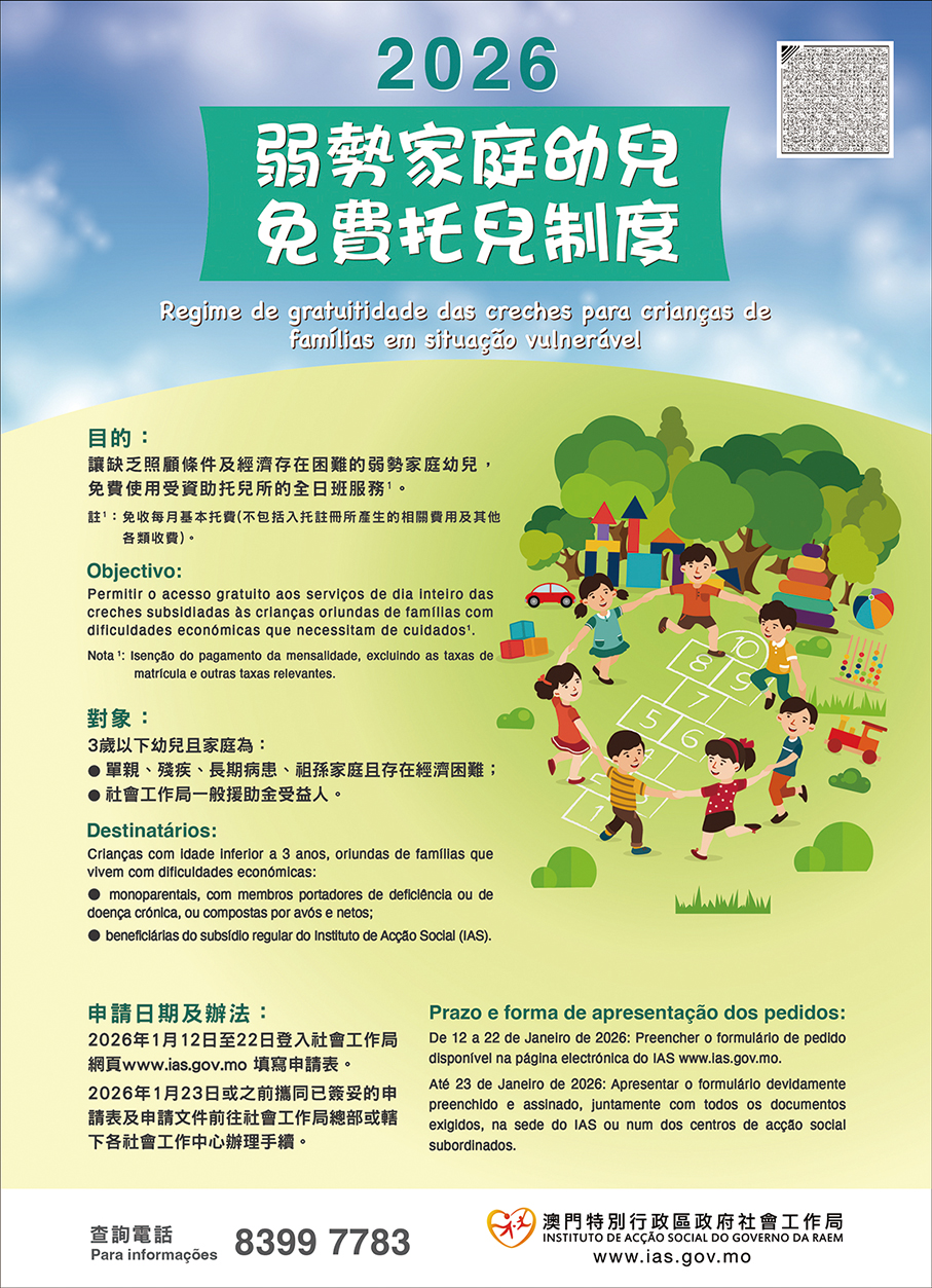 Details of the scheme and application requirements are available on the IAS website (www.ias.gov.mo). Enquiries can be made by contacting the bureau’s Children and Youth Service Division on 8399 7783 during office hours.