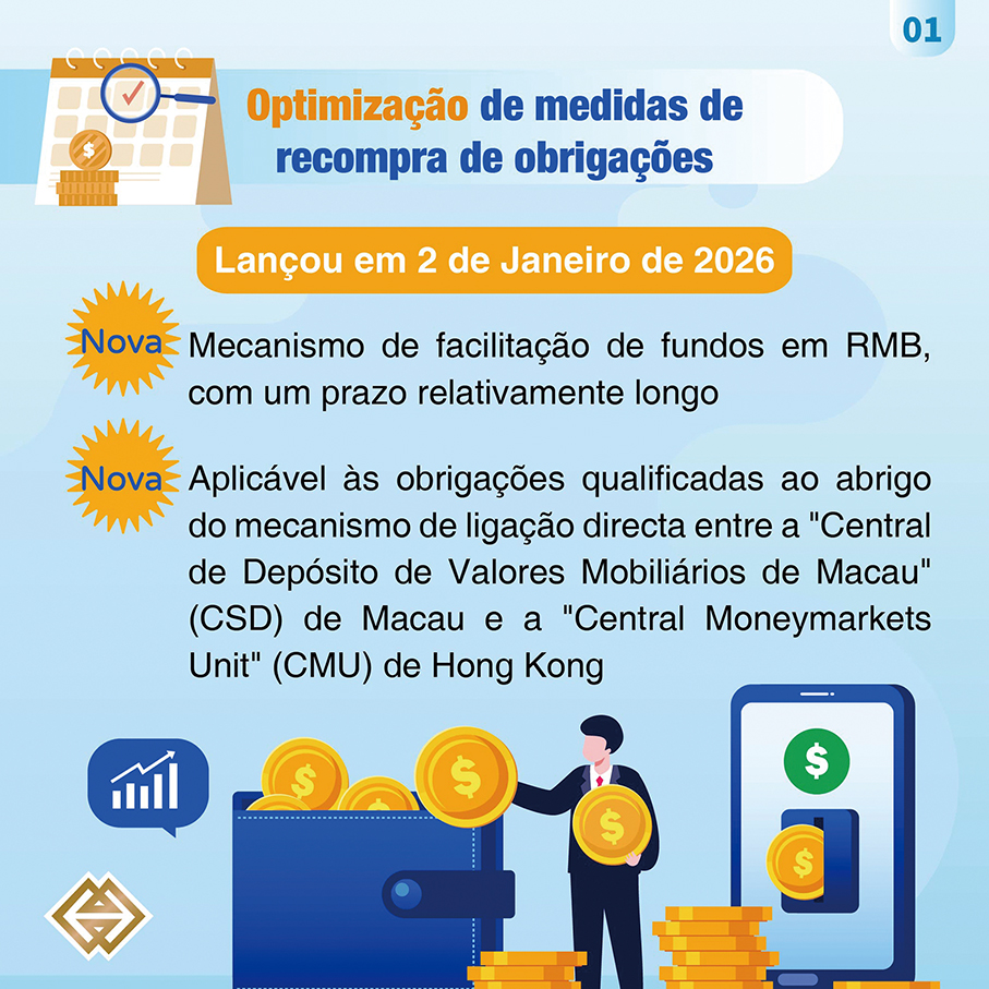 According to the statement, the optimised bond repurchase measures launched on Friday also include one allowing local banks to use eligible bonds transacted under the direct linkage between the Macau’s Central Securities Depository (CSD) and Hong Kong’s Central Moneymarkets Unit (CMU) to conduct repurchase operations, further enhancing the synergistic effects of the collaborative development between the two cities’ bond markets.