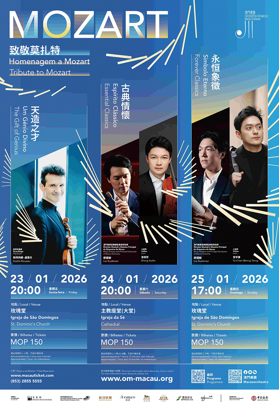 This poster recently provided by the Cultural Affairs Bureau (IC) promotes the “Tribute to Mozart” concert series of the Macao Orchestra 2025-26 Concert Season which will be held from January 23 to 25.