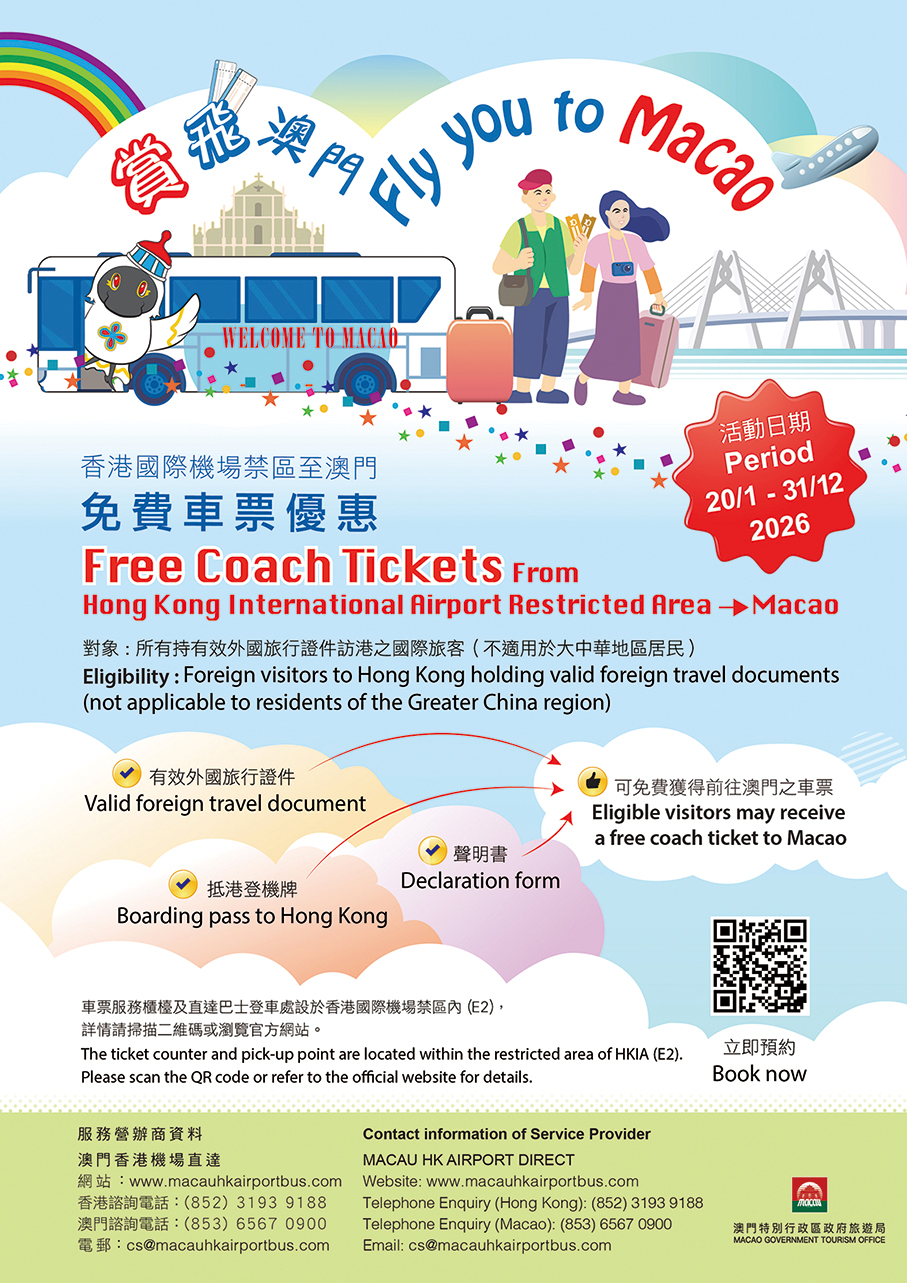 The Macau Government Tourism Office (MGTO) announced in a statement yesterday that it is rolling out a special offer today, giving international visitors free direct coach tickets from Hong Kong International Airport to Macau, in order to expand foreign visitor markets and promote extended travel to Macau.
