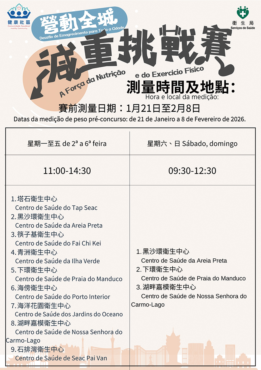 According to the statement, participants who have registered can visit health centres between January 21 and February 8 to complete pre-competition measurements, bringing either a physical or electronic Macau ID card. After completing the measurements, eligible participants will receive a confirmation notification via SMS on February 10. The statement said that all health centres are fully prepared, and relevant staff have completed training to provide residents with more convenient and accurate measurement services, working together with the community to build a “Healthy Macau.”