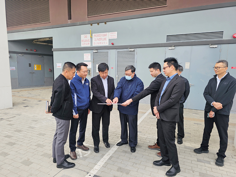 This undated handout photo released by the Housing Bureau (IH) yesterday shows Secretary for Transport and Public Works Raymond Tam Vai Man (third from left) being briefed by officials under his portfolio about their work to improve Zone A’s public transport and community facilities during his recent inspection visit there.