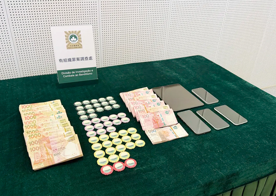 HK banknotes, gaming chips, a tablet computer, and four smartphones seized from the jewellery shop are displayed in a pressroom of the Judiciary Police (PJ) headquarters yesterday. – Photo: PJ