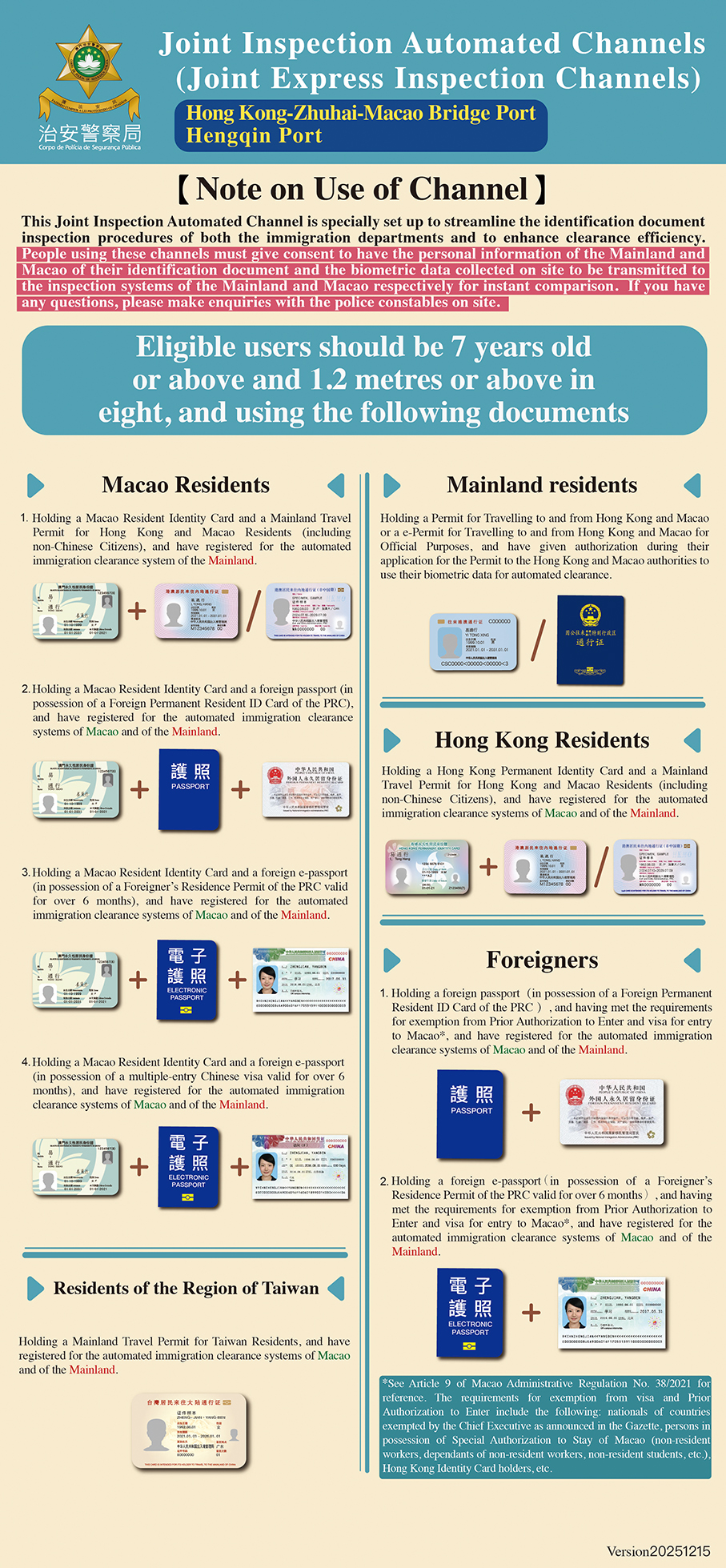 Starting today, the same categories of eligible foreign passport holders can use the automated channels at the Zhuhai-Macao checkpoint of the HZMB.