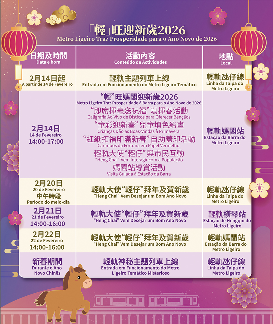 Macau Light Rapid Transit Corporation Limited (LRT) said in a statement yesterday that it will roll out a series of festive activities for the Chinese New Year (CNY), including a themed train service and a celebratory event at Barra Station this Saturday.