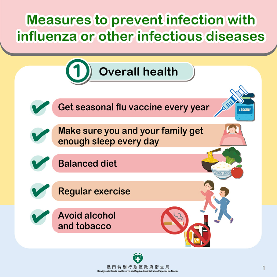 This poster provided by the Health Bureau (SSM) last night promotes ways to reduce the risk of influenza and other infectious diseases. The bureau calls on residents to strengthen personal protective measures.