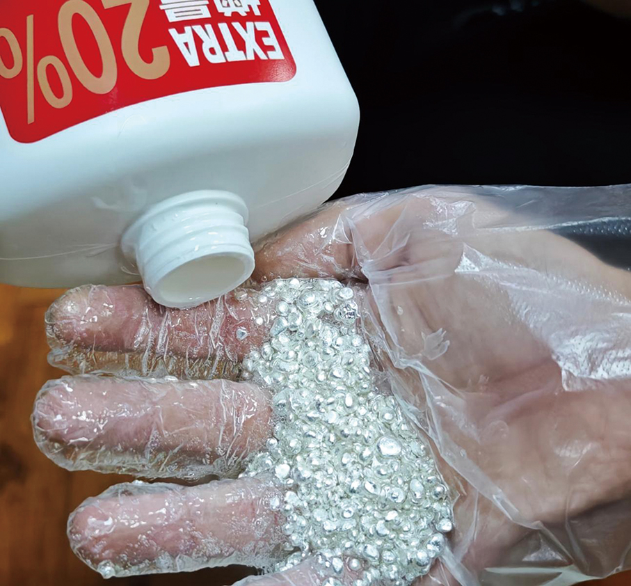 This undated handout photo released by the Macau Customs Service on Sunday shows a customs officers checking the silver granules at a parallel trading den in the peninsula’s northern district.