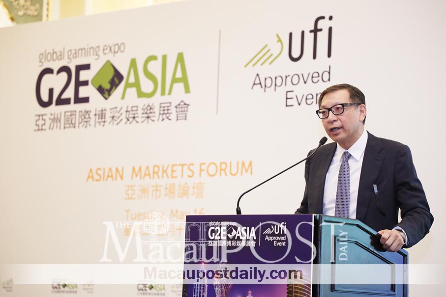 GEG Vice Chairman Francis Lui Yiu-tung addresses the Asian Markets Forum during the three-day G2E gaming expo that opened at the Venetian in Cotai yesterday. Photo: MM Marketing