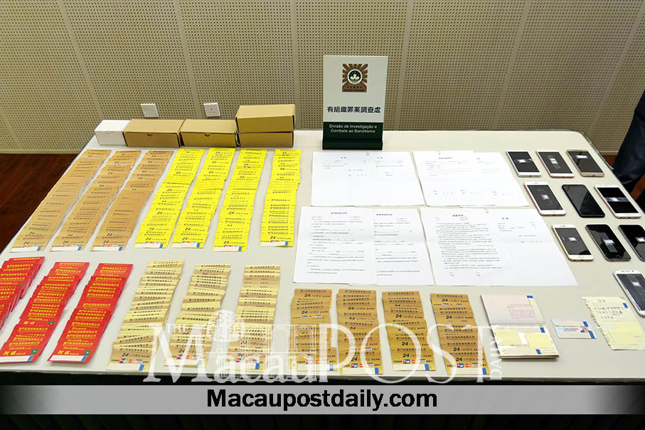 This photo taken yesterday in a Judiciary Police (PJ) pressroom shows evidence, including business cards, seized in the loan-sharking gang’s flat in Taipa.