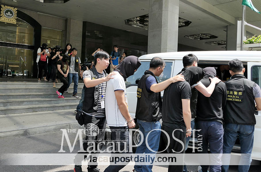 Judiciary Police (PJ) officers escort the 11 hooded loan-sharking suspects to a PJ vehicle outside the PJ headquarters in Zape yesterday. Photos: Iong Tat Choi