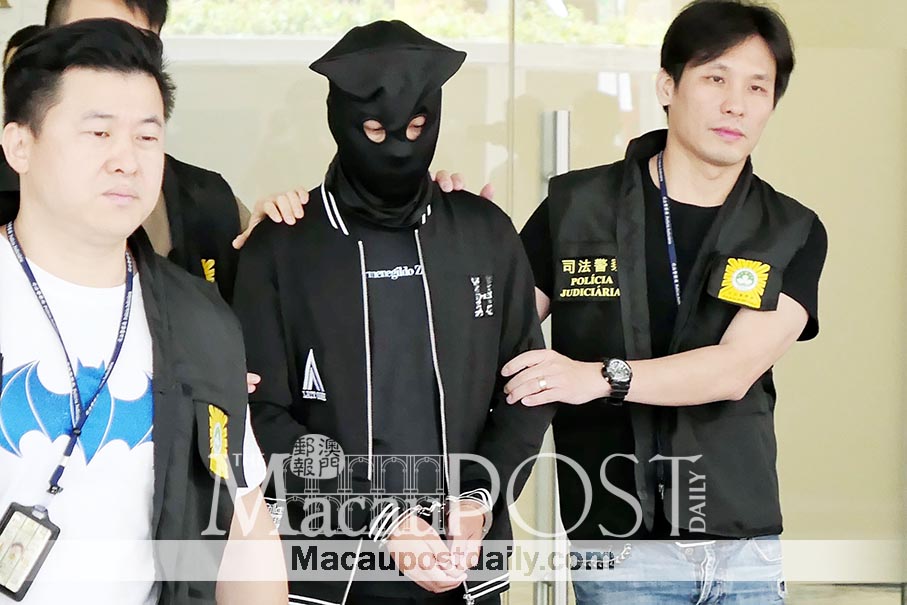Judiciary Police (PJ) officers escort the hooded suspected burglar to a PJ vehicle outside the PJ headquarters in Zape yesterday. Photo: Iong Tat Choi