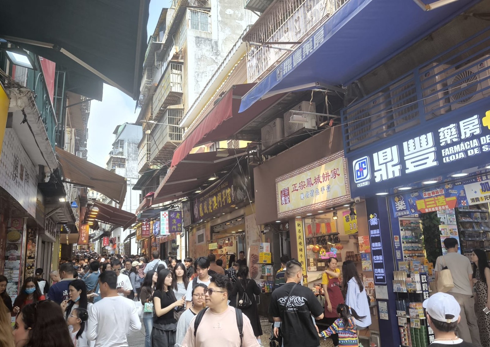 Caption: Visitors throng Macau's narrow Rua de S. Paulo last month. - Photo: Tongy Wong