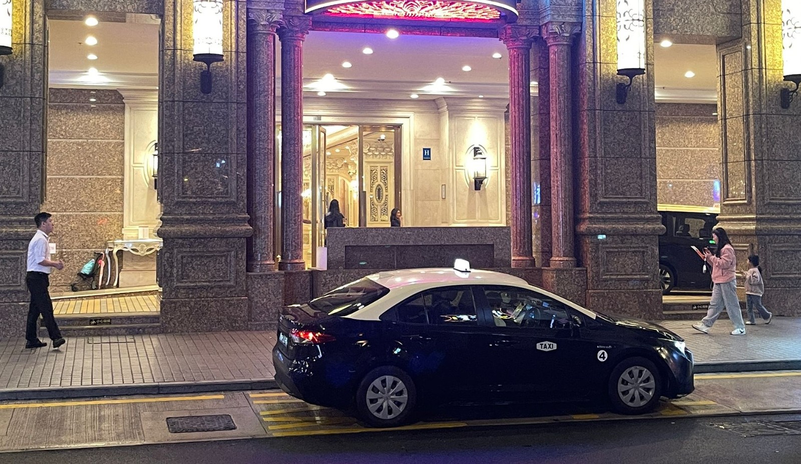 Caption: A taxi waits for passengers outside a hotel in Macau’s Zape district tonight. According to the latest available official hotel data, Macau recorded 2.47 million hotel guests in the first two months of the year, a year-on-year growth of 4.5 percent, including 210,000 foreign guests. - Photo: Armindo Neves