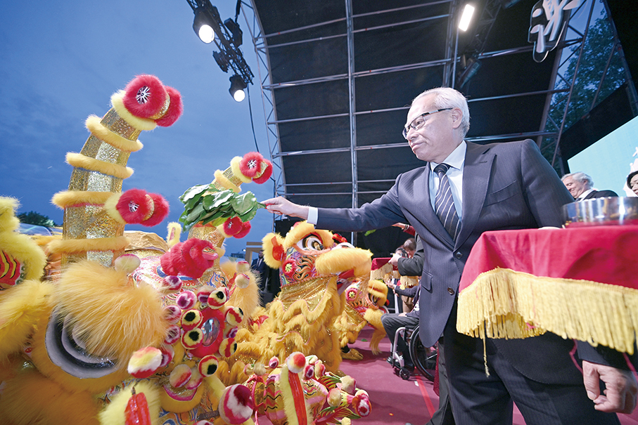 Macau Chief Executive Sam Hou Fai dots the eyes of the lion during the “Macao Night” event, the closing ceremony of the “Experience Macao Roadshow in Madrid”, on Tuesday last week (local time). The roadshow aiming to promote Macau’s tourism, held in Madrid between April 17 and 21, was jointly organised by the MSAR government and the Chinese Embassy in Spain. – Photo: GCS