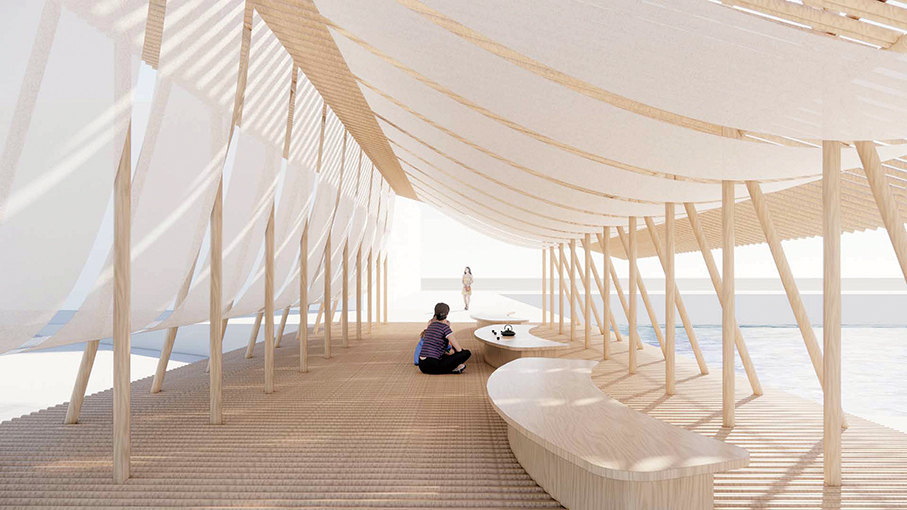 This image shows a rendering of the Tea Pavilion by Macau architects João Ó and Rita Machado.