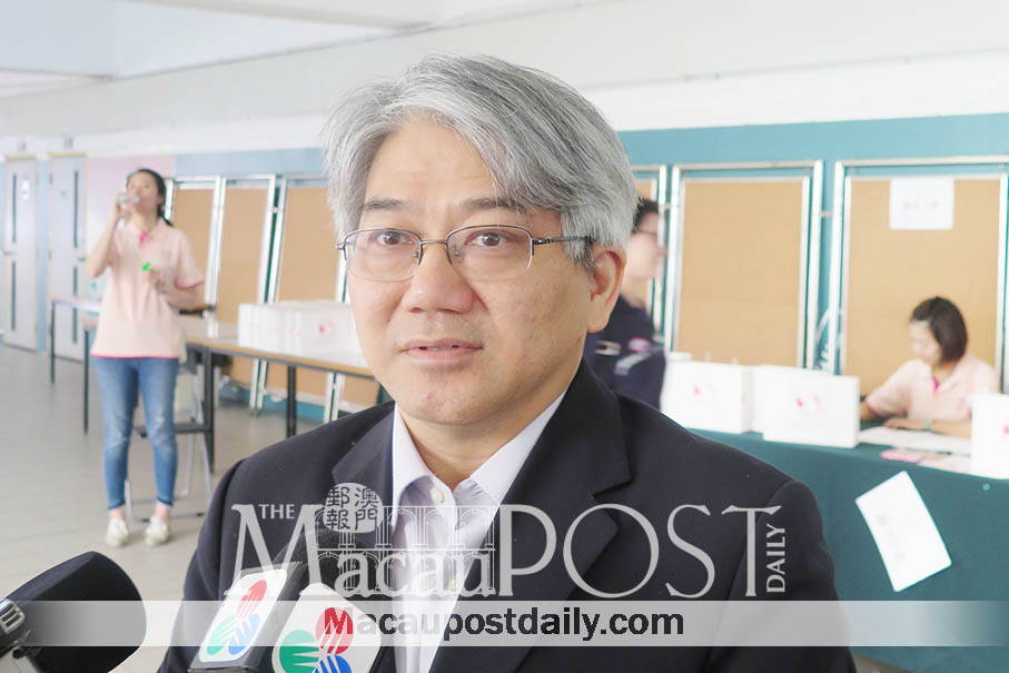 Health Bureau (SSM) Director Lei Chin Ion speaks to reporters yesterday at the Luso-Chinese Vocational and Technical School in Areia Preta. Photo: Tony Wong