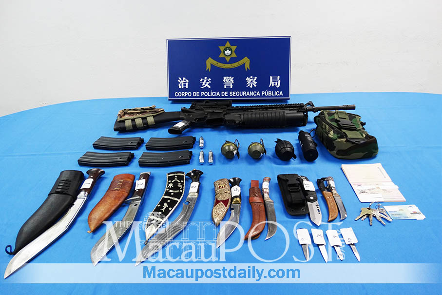 A Malaysian man surnamed Cheah, who works as a technical manager for a local casino, has been arrested for carrying and owning three daggers, three kukris, a flick knife, an air rifle and four replica grenades, a Public Security Police (PSP) spokesperson said during a regular press conference yesterday.
