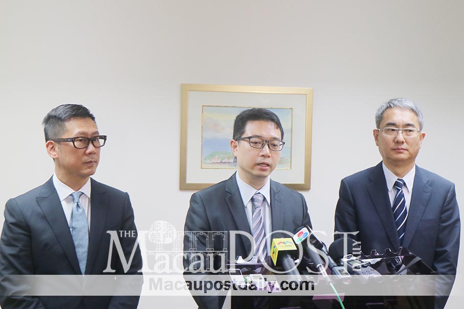 Legislative Assembly Electoral Affairs Committee (CAEAL) President Tong Hio Fong (centre) speaks to reporters after yesterday’s closed-door meeting with representatives of the city’s six gaming operators and Junket Promoters Association, as Commission Against Corruption (CCAC) chief André Cheong Weng Chon (right) and Gaming Inspection and Coordination Bureau (DICJ) Director Paulo Martins Chan look on, at the DICJ headquarters in China Plaza. Photo: Debby Seng