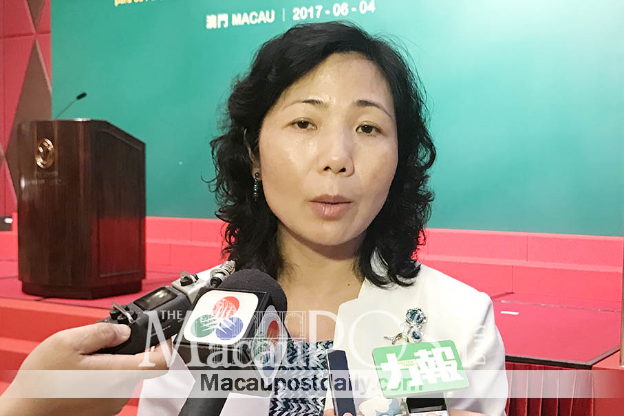 Permanent Secretariat of the Forum for Economic and Trade Cooperation between China and Portuguese-speaking Countries (Macau) Secretary-General Xu Yingzhen speaks to reporters at Grand Lisboa on the sidelines of yesterday’ certificate presentation ceremony of the two workshops organised by the Training Centre of the Forum. Photo: MPDG