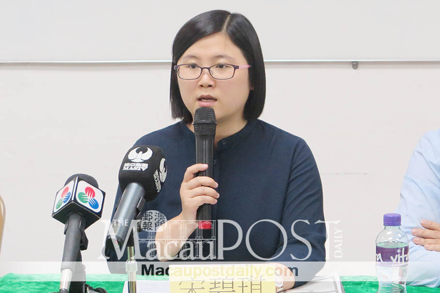 Directly-elected lawmaker Song Pek Kei, a vice-president of the Alliance for Common People Building Up Macau (API), addresses yesterday’s press conference about the group’s suggestion to toughen up the illegal inn law, on its premises in Areia Preta. Photo: Tony Wong