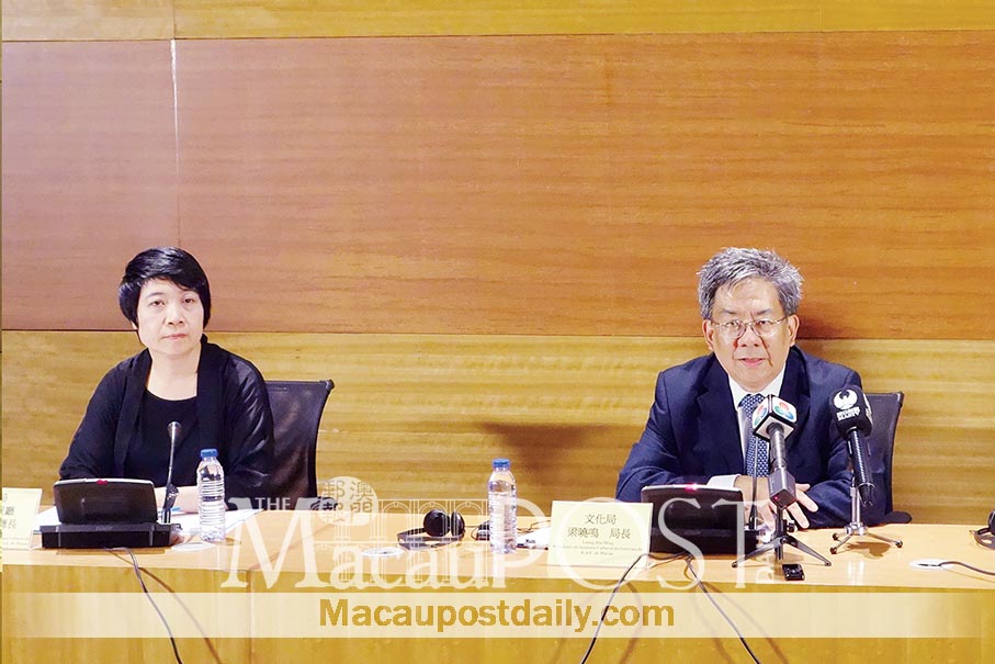 Cultural Affairs Bureau (IC) President Leung Hio Ming (right), accompanied by the bureau’s Cultural Heritage Department Chief Leong Wai Man, addresses yesterday’s press conference at the bureau. Photo: Annie Cheung