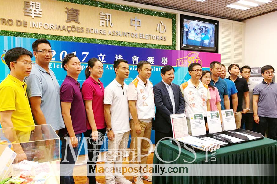This photo provided by a member of the Macau Jiangmen Communal Society shows Macau-Guangdong Union list’s representative Ian Soi Kun (seventh from left), who is the president of the society, flanked by lawmakers Mak Soi Kun (seventh from right), and Zheng Anting (sixth from left) posing at the Public Administration Building in Rua do Campo on Friday, accompanied by other members of the society.