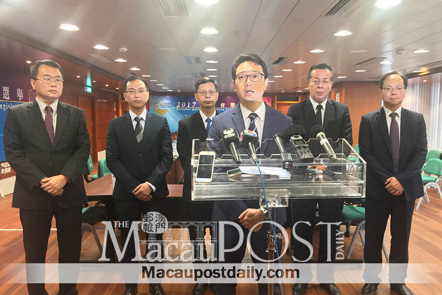 Legislative Assembly Electoral Affairs Committee (CAEAL) President Tong Hio Fong (front) speaks to reporters yesterday after yesterday’s regular meeting of the committee, as fellow committee members Victor Chan Chi Ping (behind, first from left), Kou Peng Kuan (second from left), Lai U Hou (third from left), Jose Fonseca Tavares (second from right) and Iong Kong Leong look on, at the Public Administration Building in Rua do Campo. Photo: Debby Seng