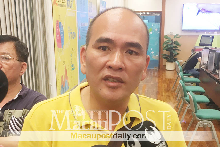 Labour rights activist Lee Sio Kuan, who heads the Grassroots Power group, speaks to reporters yesterday at the Public Administration Building in Rua do Campo. Photo: Debby Seng