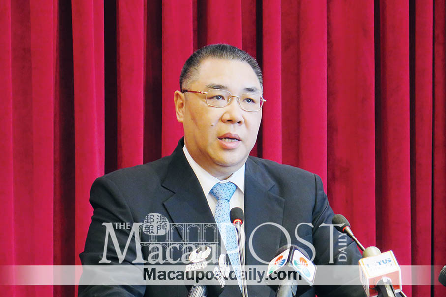Chief Executive Fernando Chui Sai On speaks to the media at the local airport yesterday. Photo: Tony Wong