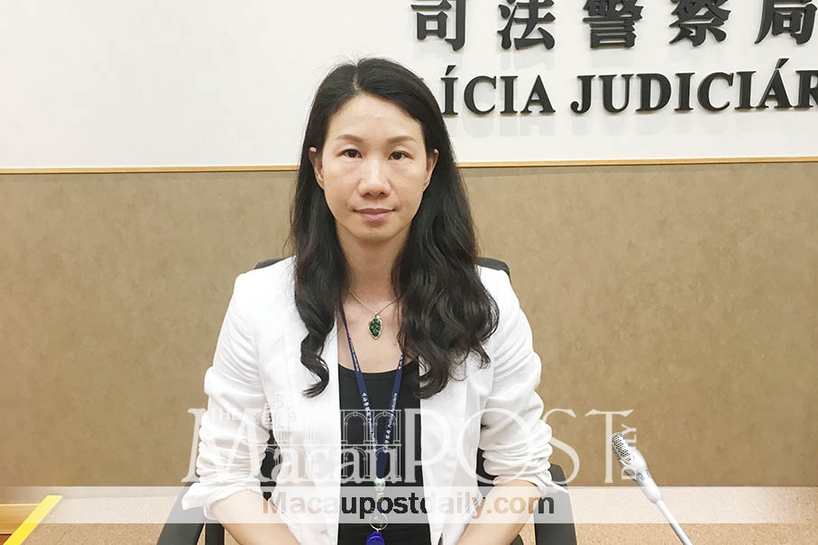 Judiciary Police (PJ) spokeswoman Yeung Sau Chan poses yesterday in the PJ pressroom in Zape. Photo: Debby Seng