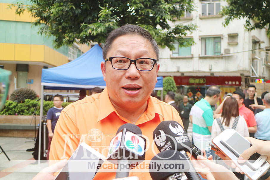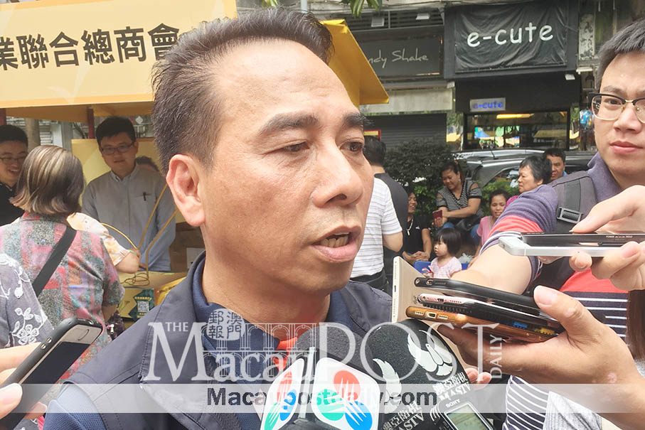 Federal General Commercial Association of Macau Small- and Medium-sized Enterprises President Fong Kin Fu speaks to reporters at Rotunda de Carlos da Maia on the sidelines of the launching ceremony of discount cards issued by the group. Photos: Debby Seng