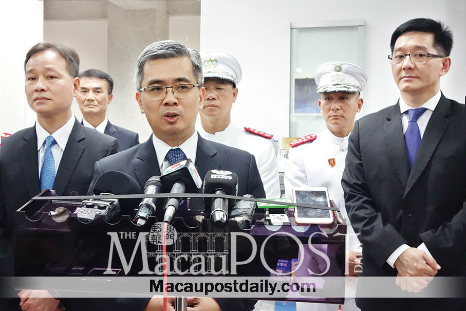 Secretary for Security Wong Sio Chak (front, centre), accompanied by Macau Customs Service Director-General Alex Vong Iao Lek (front, right) and other senior law enforcement officials, speaks to reporters at the Macau Security Forces Academy in Coloane yesterday. Photo: Annie Cheung