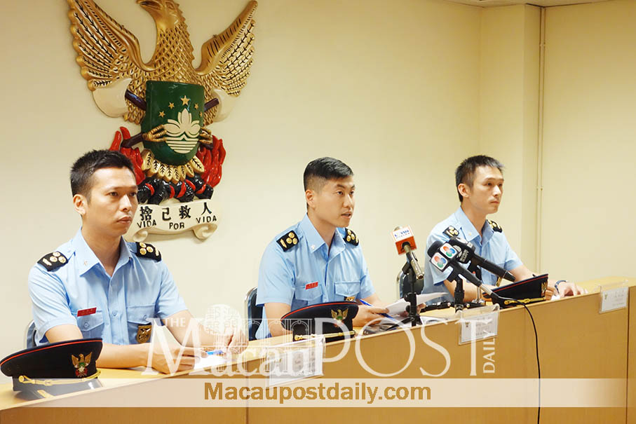 Fire Services Bureau (CB) senior officer Cheong Chi Wang (centre), flanked by fellow officers Sam Ka Hou (right) and Chu Chi Pan, addresses yesterday’s press conference at the CB headquarters in Sai Van. Photo: Annie Cheung